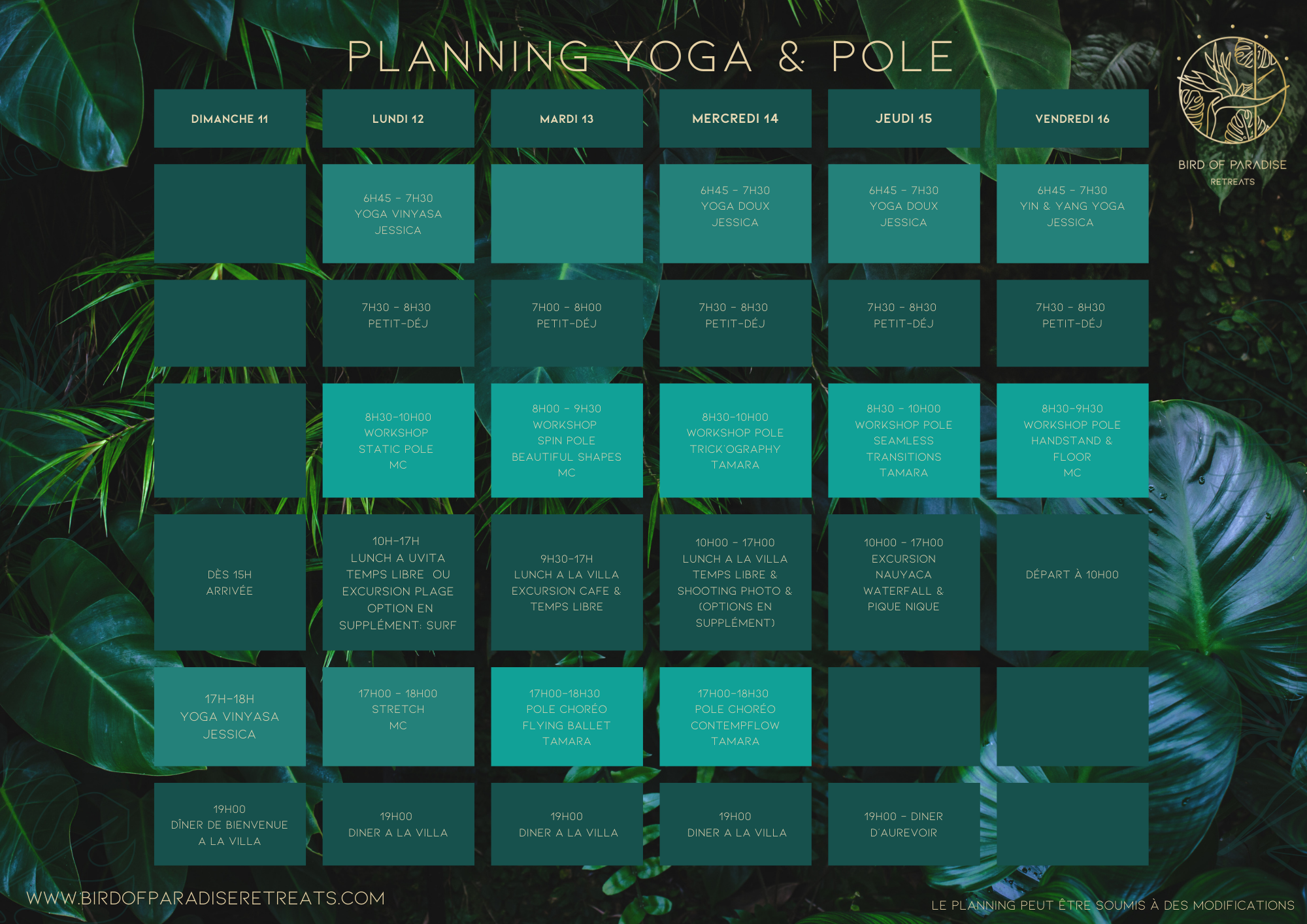Débutant les journées en douceur au rythme du soleil à travers des cours de yoga, elles seront suivies de workshops de pole dance, puis, de diverse excusions. Les débuts de soirée seront rythmés eux aussi par différents cours ou workshops puis les soirées par des repas en groupe.